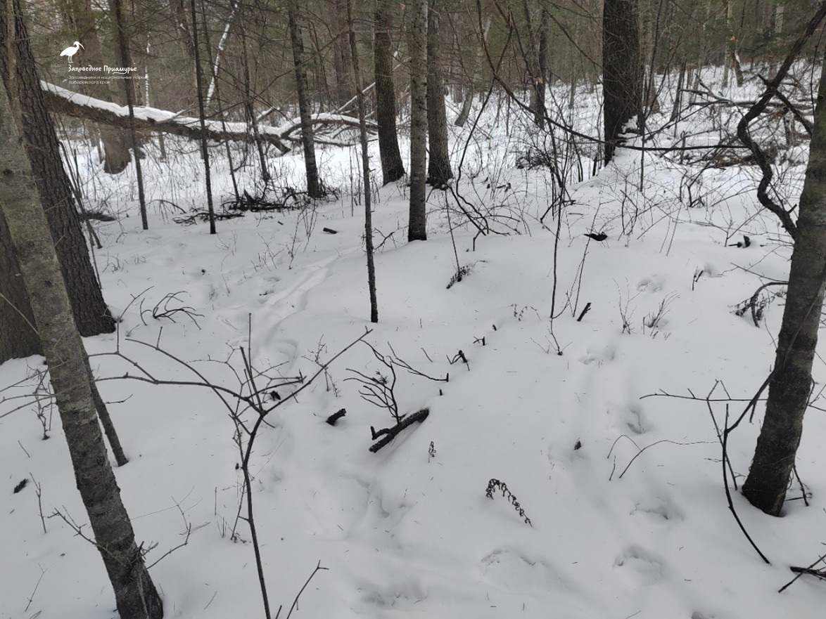 В захламлённом ветровалом участке темнохвойного леса, учётчиками встречены также старые следы тигра, который крадучись преследовал изюбрей, скрываясь за валежинами и огромными выворотнями. К сожалению, давность следов не дала возможность определить, какой конкретно особи тигра они принадлежат.