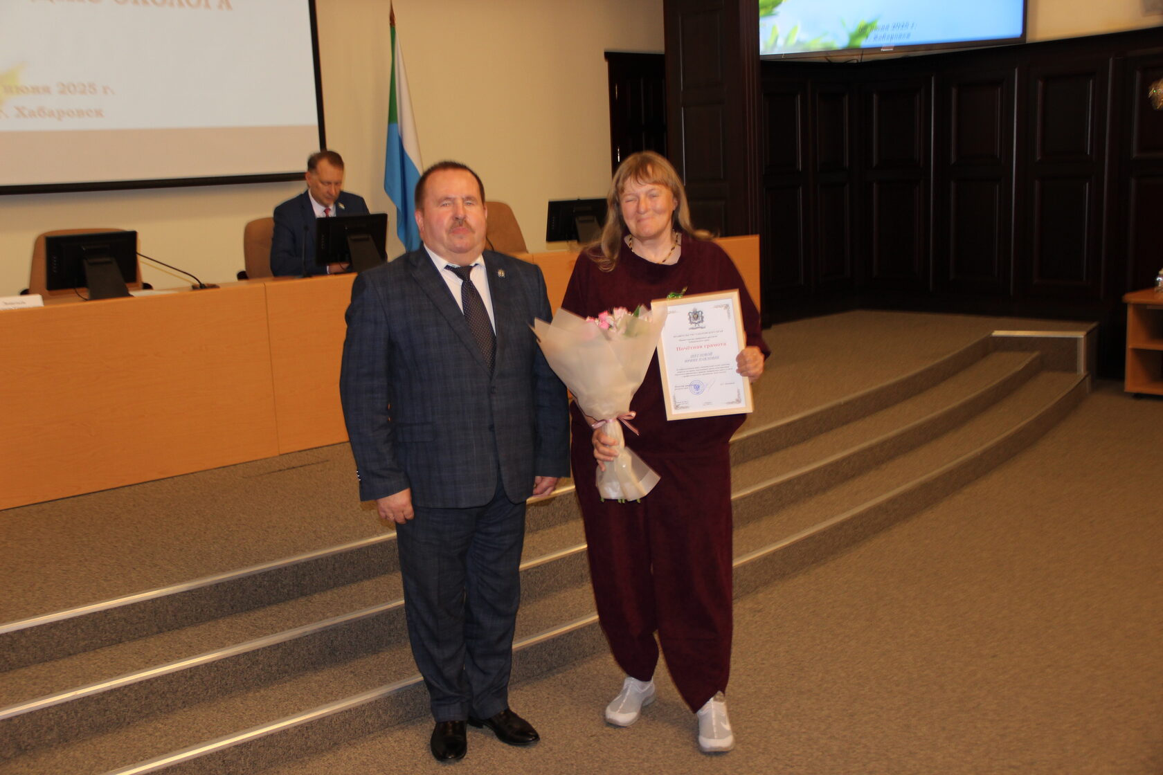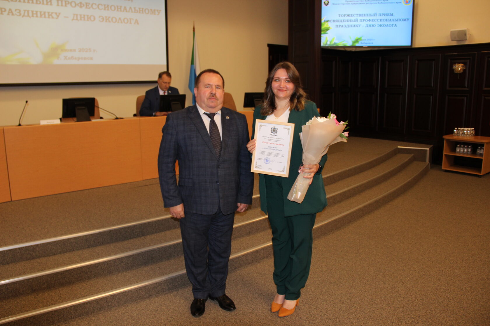 Почетной грамотой Министерства природных ресурсов Хабаровского края награждены Алина Владимировна Милежик, Сергей Сергеевич Пельменев и Ирина Павловна Щеглова.